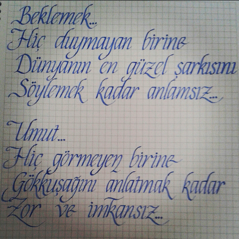Ben sabırsız ve öğrenmeyi çok istediğimden dolayı hemen gittim metal kaligrafi kalemi aldım. Bayağı bir para bayıldım o ayrı :) Ama kalemden mürekkep gelmedi. Hocama facebooktan mesaj attım sağolsun hemen cevap verdi. Çok yardımcı oldu. Sadece ders saatlerinde gösteririm gibi bir düşüncesi yok. Bana çalışmalarımı göstermek için pazartesiyi beklemek istemezsem mesajla gönderebileceğimi söyledi. Valla ben hocama bayıldım. :)